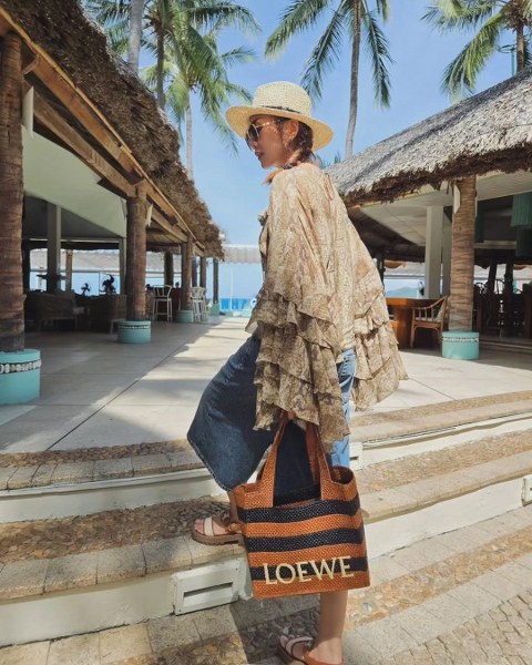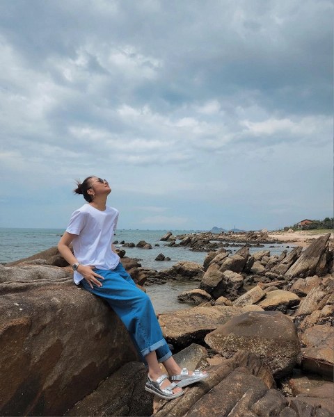 Thời trang dạo biển của diễn viên Mỹ nhân kế với mốt áo thể thao và quần jeans ống rộng.