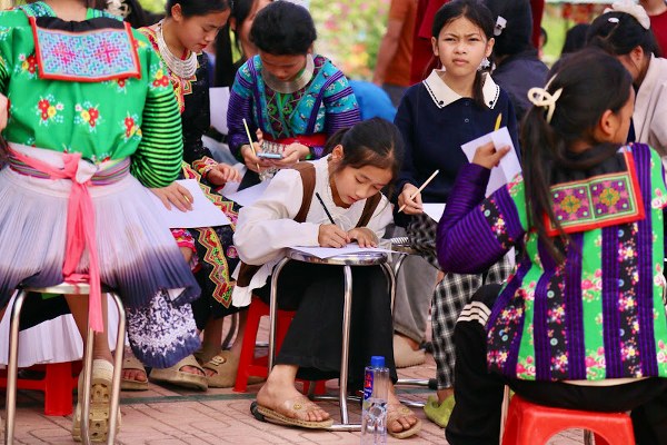 Các em nhỏ tại điểm trường PTDTBT THCS xã Khoen On tham gia hoạt động vẽ tranh