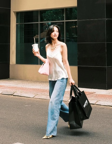 Người đẹp còn có một chiếc áo ngủ bằng lụa đắp ren. Để bộ cánh toát lên vẻ sang trọng, cô kết hợp quần jeans, giày kitten và túi Marc Jacobs.