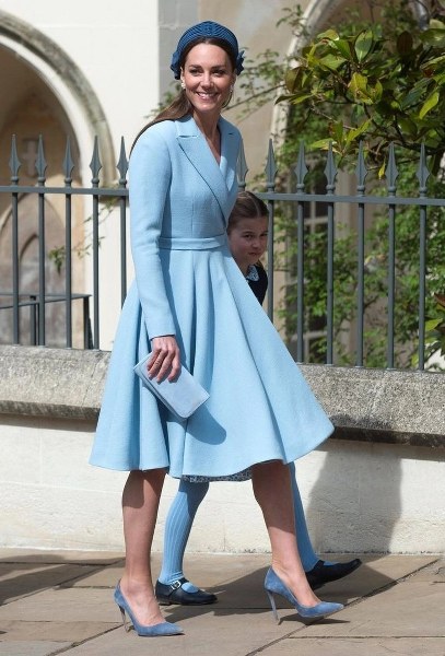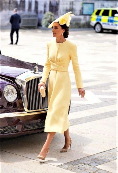 Ở một sự kiện khác, cô chọn đầm vàng tươi ăn ý mũ kiểu cách. Vương phi Kate Middleton mang giày gót nhọn da lộn quanh năm, dù đây là thiết kế đặc trưng của mùa Thu Đông. Cô sắm nhiều đôi giống nhau chỉ khác màu để tiện phối, như nude, champagne, xanh dương đậm.