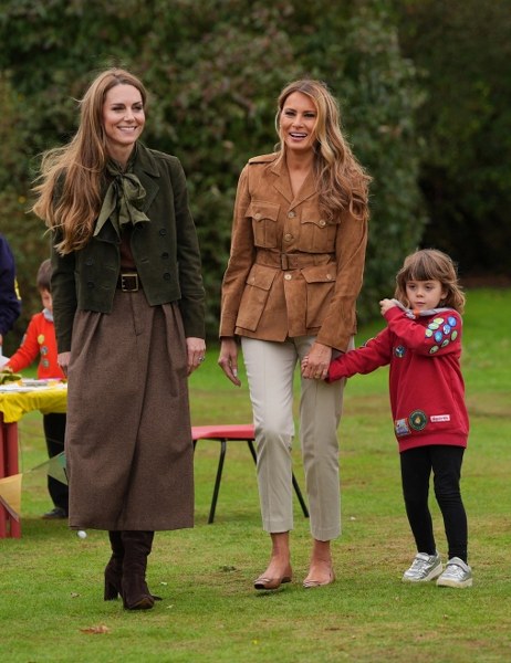 Vương phi Kate chọn nhiều trang phục tông xanh olive và nâu trong các sự kiện, đây đều là những tông màu hot của Thu Đông 2025. Hôm 18/9, cô và bà Melania Trump đến thăm các bé ở phía nam lâu đài Windsor. Cô diện áo khoác xanh lục và áo len của thương hiệu Anh ME+EM, chân váy midi màu nâu Ralph Lauren và bốt cao cổ.
