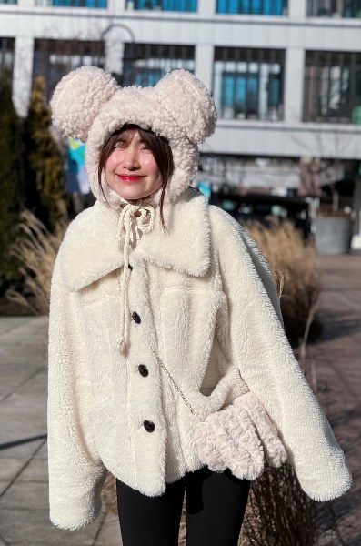 Trong những ngày lạnh, cô thể hiện vẻ đáng yêu bằng áo lông đi kèm mũ tai gấu.