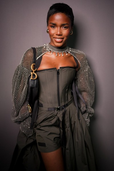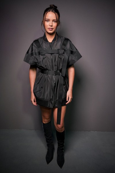 Diễn viên Mallory Wanecque diện mốt giấu quần với áo bomber dài tô điểm bằng dây đai.
