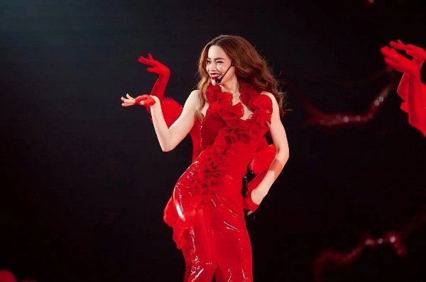 Ca sĩ Hồ Ngọc Hà, 40 tuổi, thường xuyên chọn váy áo màu đỏ kết hợp son môi và giày đồng điệu.
