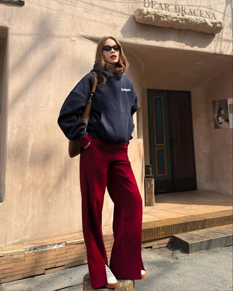 Trước đó một tháng, khi tới Hàn Quốc, cô cũng ưu tiên chọn quần vải xẻ tà sắc màu này thay vì quần jeans như mọi khi.