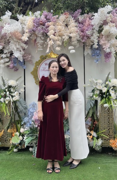 Hoa hậu kết hợp trang phục đơn sắc với giày bệt trong một lần cùng mẹ dự ngày vui của người thân.