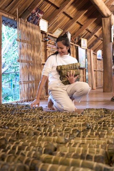 H'Hen Niê cùng ba mẹ, cô dì, chú bác, bạn bè chuẩn bị lá chuối, hàng chục cân nếp, thịt, đậu xanh để gói bánh.
