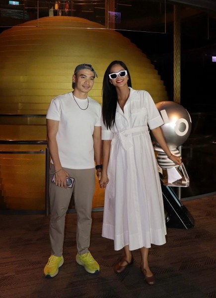 Cô mặc váy suông, đồng điệu màu sắc với trang phục của chồng khi thưởng thức bữa tối tại một nhà hàng trên cao.