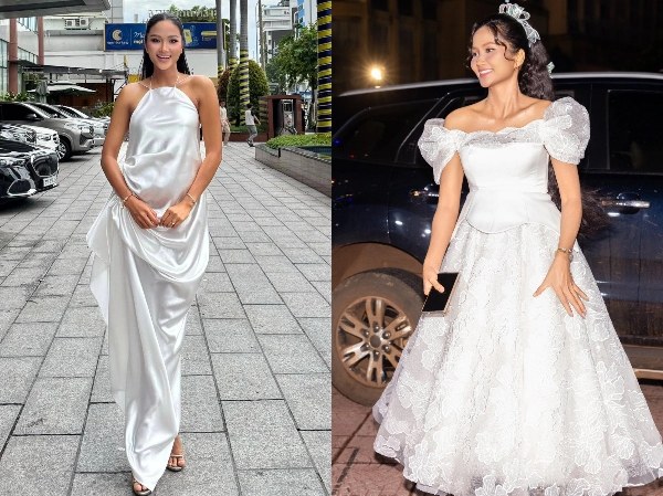Lúc chưa công bố chuyện mang thai, H'Hen thường diện đầm rộng, có độ rũ tự nhiên hoặc váy nhiều lớp để giấu vòng hai khi xuất hiện trước công chúng.