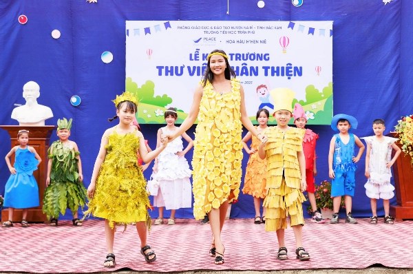 Mỹ nhân mặc váy đính kết hoa, vui đùa cùng các em nhỏ tại hoạt động trao tặng thư viện - dự án do cô phát động - ở Bắc Kạn hồi cuối tháng 5.