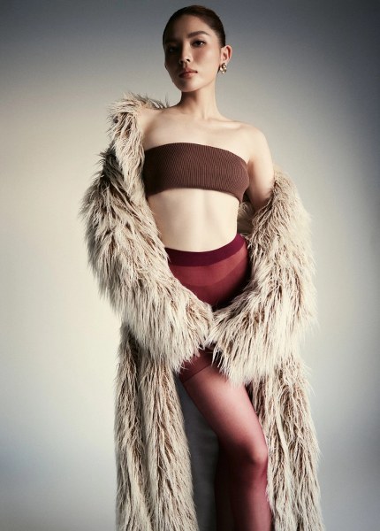 Mỹ nhân từng diện hàng chục mẫu áo cùng phong cách, đa dạng chất liệu và phụ kiện. Hồi đầu năm, cô kết hợp áo với chân váy dài dáng đuôi cá, nhuộm tóc màu nổi.