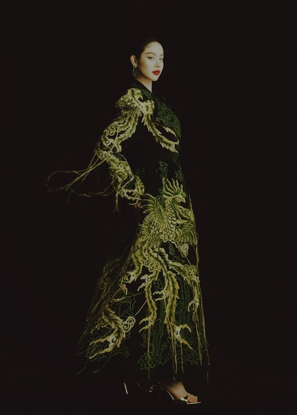 Áo khoác dáng váy thêu họa tiết chim và hoa sen tốn hàng trăm giờ thực hiện, thích hợp cho những sự kiện trang trọng.