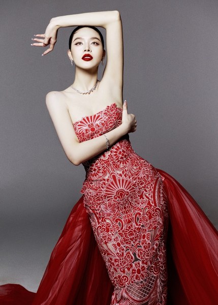 Họa tiết quen thuộc như rồng, phượng, sen, mây được khai thác trên các mẫu đầm dự tiệc hiện đại như trễ vai, đuôi cá, cape.