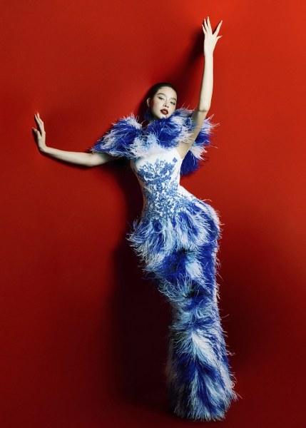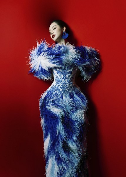 Một thiết kế đầm dáng cột gợi liên tưởng đến những chiếc bình gốm, hoa văn thêu cách điệu ở thân trên, kết hợp lông vũ được sắp đặt theo từng mảng màu.