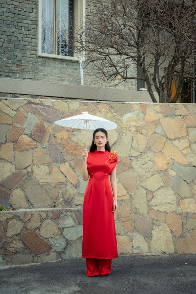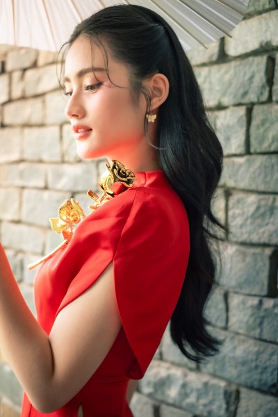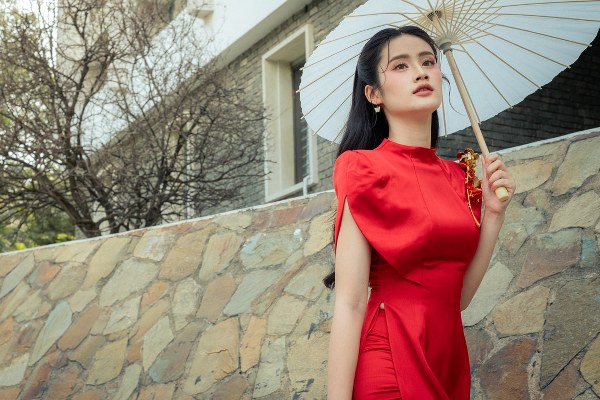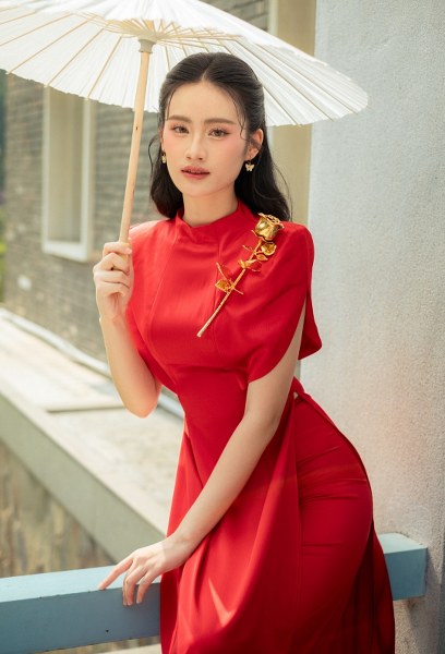 Trong bộ áo dài cách tân màu đỏ rực rỡ, Ý Nhi toát lên vẻ đẹp thanh lịch với làn da trắng nổi bật. Thiết kế xẻ tà tinh tế và những họa tiết thêu tay tỉ mỉ giúp tôn lên vóc dáng thanh mảnh của người đẹp.