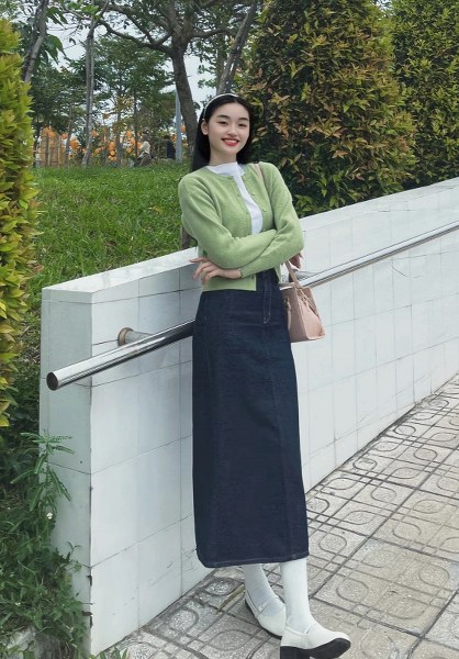 Cô thường trang điểm nhẹ nhàng khi đi học hoặc du lịch.