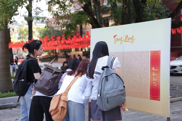 Điểm nhấn nổi bật tại sự kiện năm nay là bảng vàng ghi danh hơn 600 tân sinh viên khóa 45. Danh sách được đặt trang trọng ngay tại khu vực trung tâm, như một cách vinh danh nỗ lực học tập của các tân binh sau 12 năm đèn sách. Bảng vàng không chỉ tạo điểm nhấn độc đáo, mà còn mang ý nghĩa khích lệ tinh thần hiếu học, nhắc nhở về truyền thống khoa bảng của dân tộc.