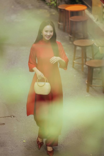Kiểu tóc dài đơn giản kết hợp phụ kiện túi cói và cành hoa tươi thắm đem lại không khí Tết tưng bừng trong mỗi khung hình.