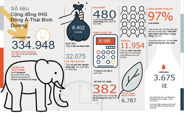 Gần 12.000 nhân viên IHG trên toàn khu vực Đông Á và Thái Bình Dương đã tích cực tham gia các hoạt động cộng đồng trong năm 2024, đóng góp hơn 32.000 giờ làm việc cho các hoạt động tại địa phương, đồng hành cùng 382 tổ chức đối tác tại 18 quốc gia.