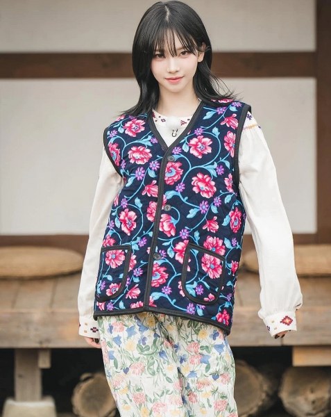 Ca sĩ Jennie nhóm Blackpink là một trong những sao lăng xê mốt này. Bức ảnh cô mặc áo gilet hoa với sweatshirt xám được lan truyền khắp mạng xã hội, khuấy động làng mốt Hàn Quốc.