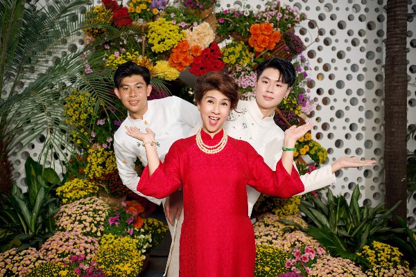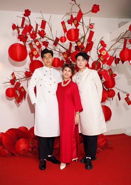 Diễn viên Kim Thư và con trai - Phước Quang, 18 tuổi, Phước Thịnh, 17 tuổi - cùng diện áo dài, chụp ảnh đón Tết Nguyên đán 2025.