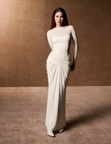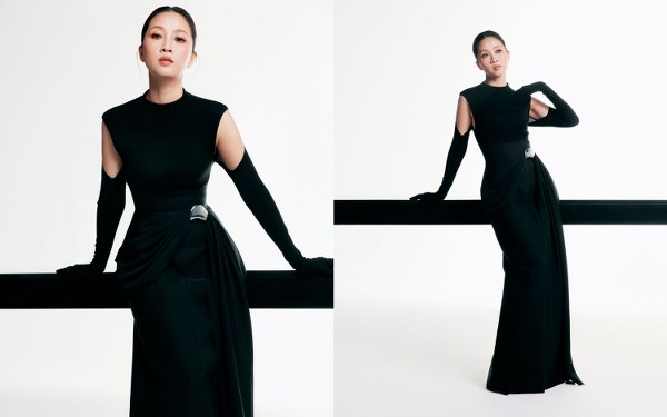Liêu Hà Trinh nổi bật trong thiết kế đầm dài ôm thân với chi tiết xếp nếp hông ấn tượng, thể hiện sự dứt khoát và bản lĩnh.