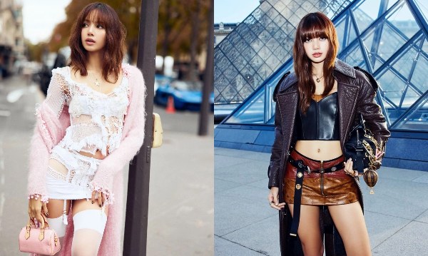 Lisa dạo phố Paris tháng 10 năm ngoái (trái) với mốt đan móc thủ công, lộ nội y của Lou de Bètoly, xách túi Louis Vuitton. Tại Paris Fashion Week 2024, fan khen ca sĩ toát lên vẻ sang trọng, quyền lực với "cây" Louis Vuitton chất liệu da.