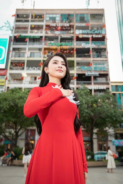 Hoa hậu Du lịch Việt Nam toàn cầu 2022 là người đẹp hiếm hoi chọn màu áo dài đỏ làm trang phục cho bộ ảnh mừng Đại lễ.