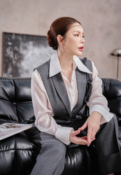 Phom dáng vest được cắt may tỉ mỉ với cổ đôi, tôn lên vóc dáng thanh mảnh nhưng vẫn giữ được nét mạnh mẽ.