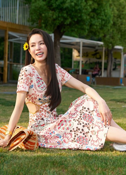 Diễn viên diện váy hoa, làm điệu khi đi chơi cuối tuần.