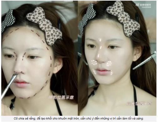Cô cho biết, đối với những ai có dáng mặt tròn như mình, việc tạo khối đúng cách sẽ giúp khuôn mặt trở nên sắc nét và gọn gàng hơn. Cô chia sẻ rằng, để tạo khối cho khuôn mặt tròn, cần chú ý đến những vị trí cần làm tối và sáng.