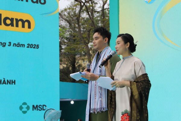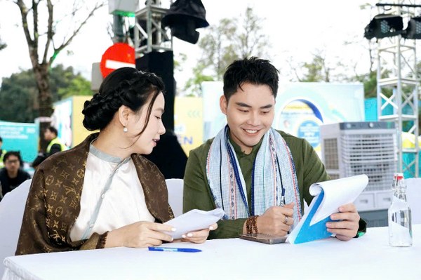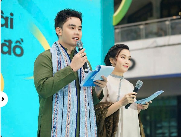 Không chỉ dẫn trên sân khấu, cặp MC còn tham gia diễu hành cùng mọi người. Cả hai đều diện áo dài.