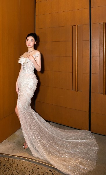 Thiết kế tạo hiệu ứng phát sáng lấp lánh dưới ánh đèn flash, đồng thời kết hợp chi tiết cánh bướm tinh tế ngay phần ngực và đường xẻ tà cao đầy quyến rũ.