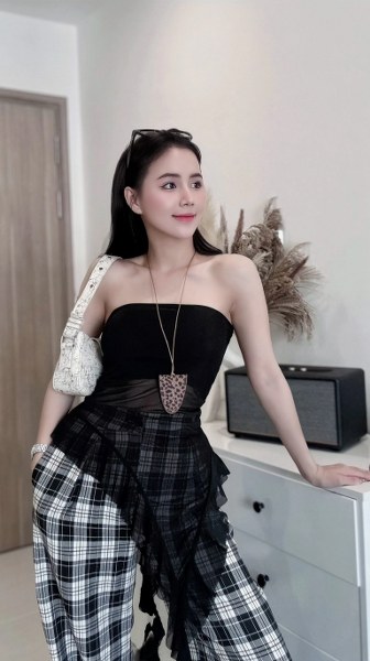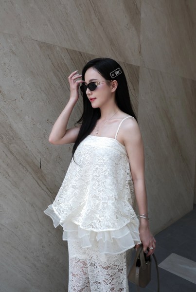 Minh Thu cũng luôn biết làm mới hình ảnh với những thiết kế có điểm nhấn hơn: Lúc là set váy áo hai dây ren trắng, dáng suông nhẹ, khi lại chọn áo quây phối cùng quần kẻ ô suông đơn giản, nhưng vẫn khoe khéo bờ vai thon và vẻ ngoài hiện đại, cuốn hút.