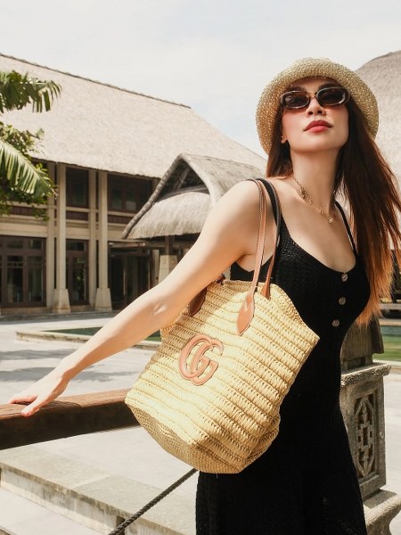 Trong chuyến đi đầu tháng 6, Hồ Ngọc Hà sử dụng chiếc túi cói Gucci khi diện váy đan móc trong khu nghỉ dưỡng.