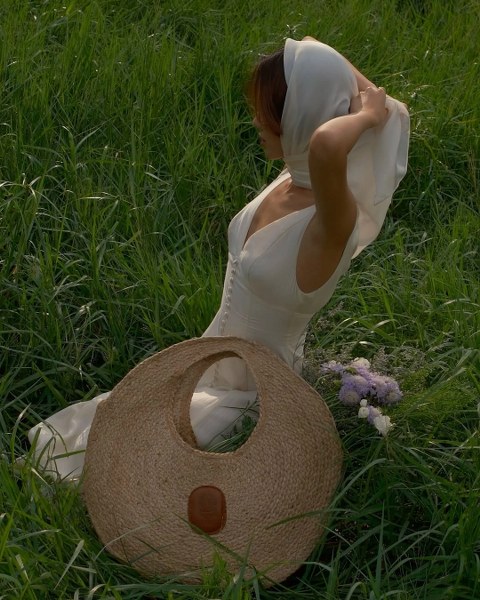Người mẫu Khánh Linh tạo điểm nhấn cho bộ đầm lụa cổ điển bằng túi cói hình bán nguyệt.