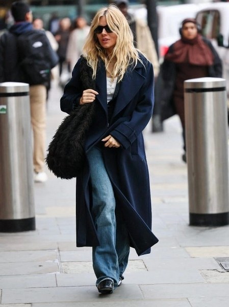 Nhiều nghệ sĩ còn chọn áo măng tô dạ mỏng, trong đó có diễn viên Sienna Miller. Cô tạo vẻ phóng khoáng bằng mái tóc xoăn nhẹ, quần jeans ống đứng và giày bệt.