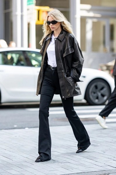 Người mẫu Elsa Hosk dạo phố với quần ống loe, áo khoác da dáng dài và kính phong cách vị lai.