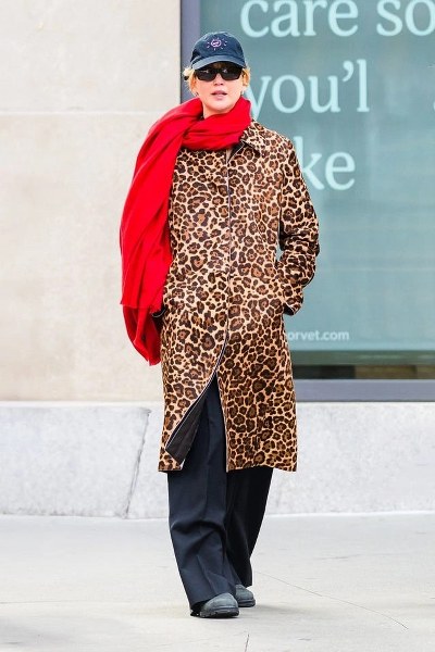 Cuối tháng 10, Jennifer Lawrence đi mua sắm trên phố. Cô diện áo khoác da báo, nhấn bằng khăn quàng đỏ. Vogue nhận xét cách mặc của cô toát lên vẻ cổ điển và gần gũi.