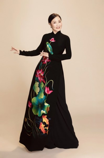 Hình ảnh trên mẫu áo dài đen được các nghệ nhân thêu tay bằng sợi chỉ có độ óng ánh.