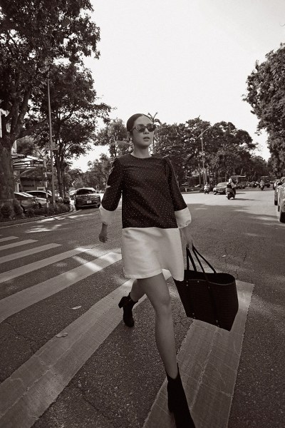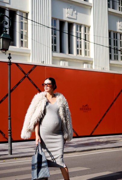 Mới đây, trên trang cá nhân, Hoa hậu Ngọc Hân đăng tải loạt ảnh dạo chơi trên phố Hà Nội, khoe "bụng bầu vượt mặt" trong trang phục váy ôm màu xám, khoác áo choàng lông màu kem, kết hợp kính râm, túi xách Dior và boots cao gót cá tính.