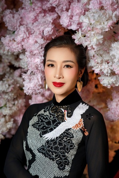 Người đẹp Nguyễn Thu Hương, 47 tuổi, thể hiện bộ sưu tập áo dài kết hợp chất liệu lãnh Mỹ A và chirimen của Nhật Bản.