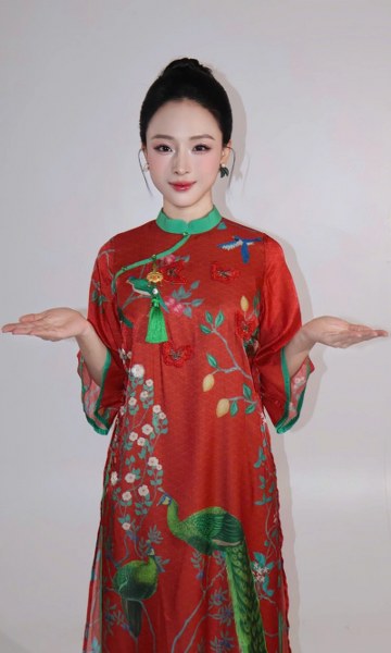 Cô mặc áo dài gấm, họa tiết cổ điển của nhà thiết kế Hà Thanh Việt tại sự kiện hồi tháng 12/2025. Phương Nga kết hợp trang phục với phụ kiện bông tai, hoa cài đầu đồng điệu.
