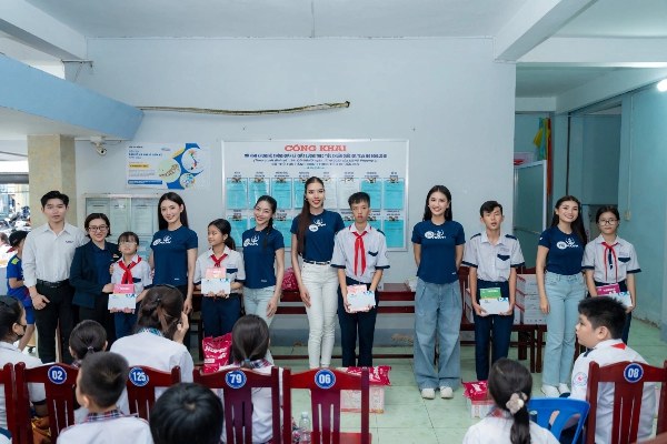 Phương Linh (thứ tư từ phải sang) phối áo thun, quần ống rộng, giày thể thao tại buổi sinh hoạt cùng các em học sinh.