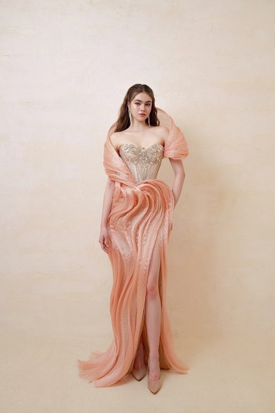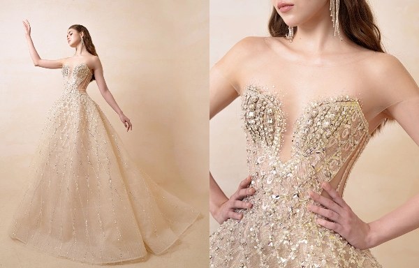 Phong cách cao cấp được thể hiện qua kỹ thuật đính kết, xếp lớp, tạo hình 3D, gắn đá, thêu nổi, nhuộm vải, gấp vải origami hoàn toàn thủ công.