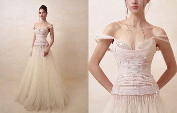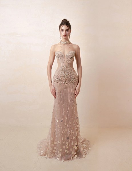 Một thiết kế xuyên thấu bằng tulle với thân trên dựng phom corset, nhấn bằng hoa vải 3D.