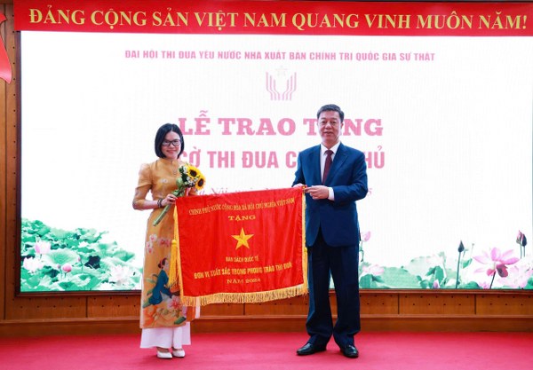 PGS.TS. Vũ Trọng Lâm, Giám đốc - Tổng Biên tập, Chủ tịch Hội đồng Thi đua - Khen thưởng Nhà xuất bản trao Cờ thi đua của Chính phủ cho Ban sách Quốc tế