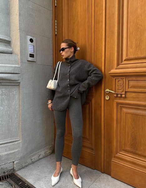 Một cô gái diện cả bộ màu xám với cardigan, nhấn bằng giày bệt và túi trắng.