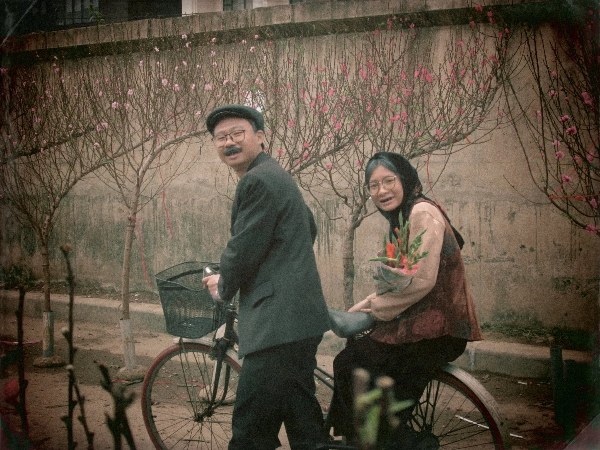 Nhóm bạn trẻ hóa thân các cụ già, tái hiện không khí thời xưa với cảnh dắt xe đạp, xách làn đi chợ hoa sắm Tết.