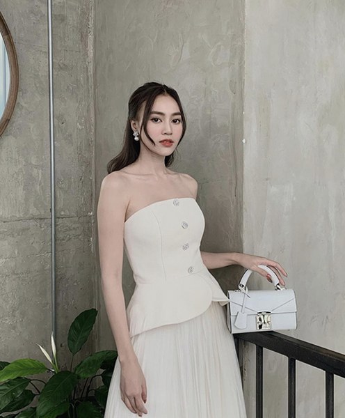 Lan Ngọc khoe vai gầy, eo thon cùng set đồ phối màu white on white với váy xòe phối vải xếp ly hợp mốt.